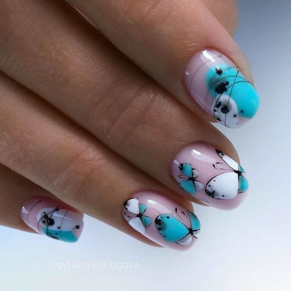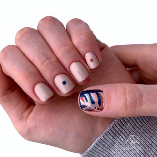 Красивый маникюр, который сможет сделать самостоятельно даже юная школьница, это дизайн с точками. Кроме горошка, с помощью точек можно создать оригинальный узор. В технике дотс модно рисовать птичек, бабочек и яркую абстракцию.