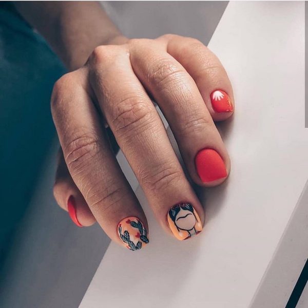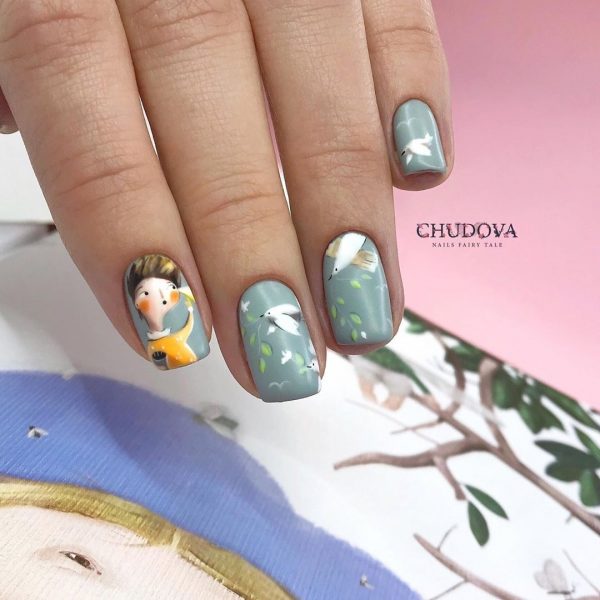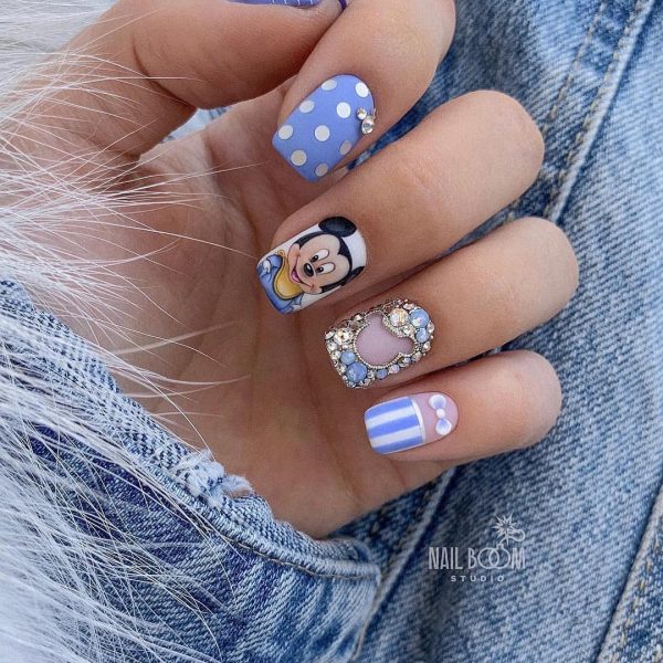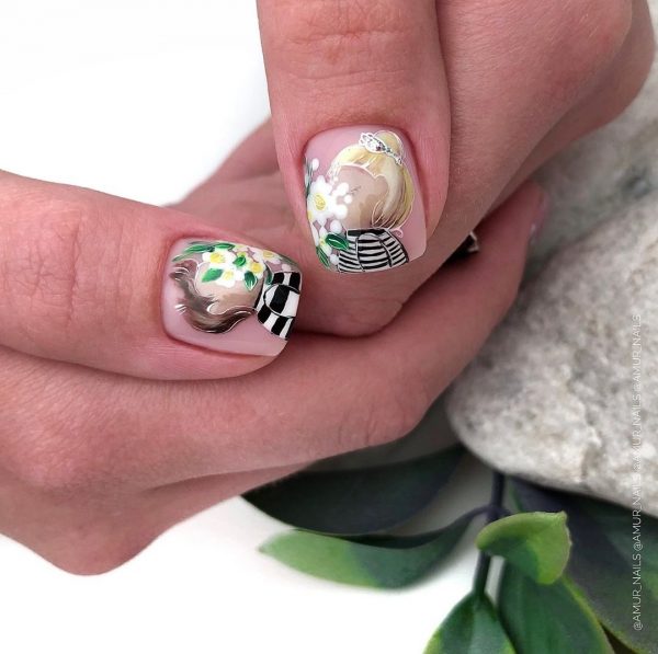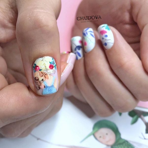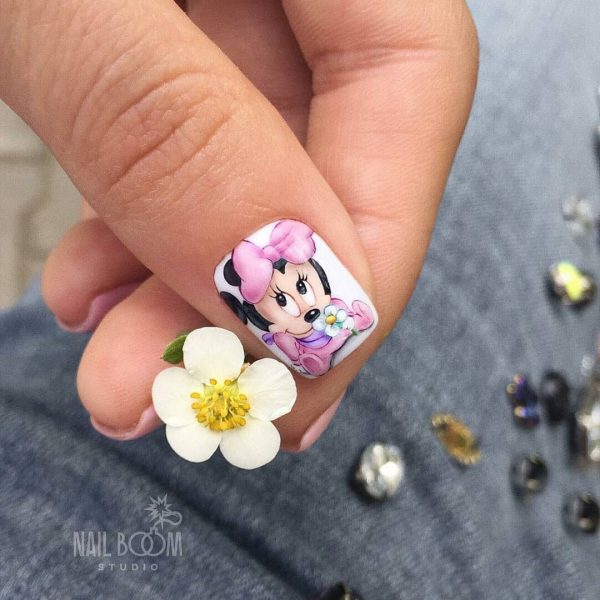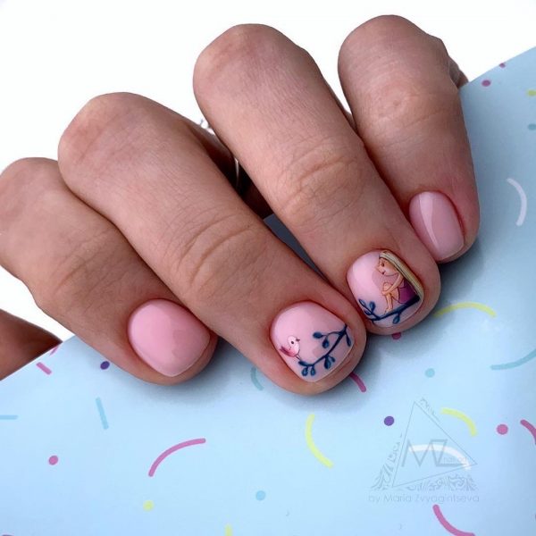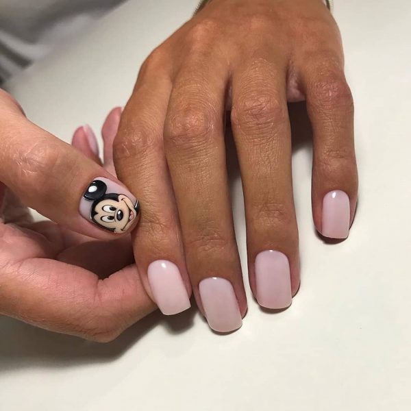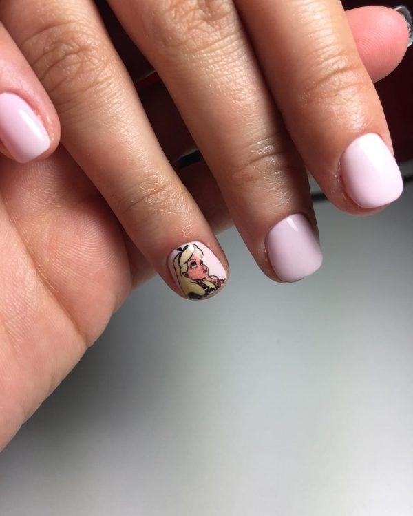 Очень мило и круто в коротком маникюре в школу 2026 будут смотреться рисунки с любимыми персонажами и героями мультфильмов, кинофильмов, комиксов и сказок. Красивый портрет принцессы, забавный Микки и смешной Пикачу нарисованные кистью на отдельных ноготках никогда не будут лишними в дизайне школьного маникюра.
