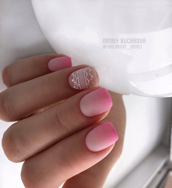 Самым девчачьим оттенком всегда считали розовый, поэтому нежному розовому маникюру нет равных, особенно когда речь идет о дизайне ногтей в школу. Для принцесс и юных леди розовый школьный маникюр 2026 предлагает не зацикливаться на монохроме. Легкий градиент, вензельный белый узор, и конечно же френч и лунный розовый маникюр на коротких ногтях будут выглядеть очень симпатично и легко.