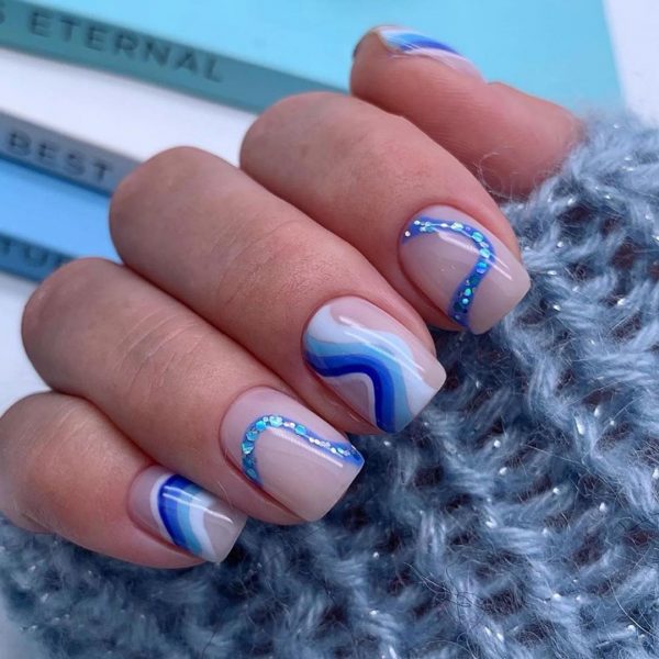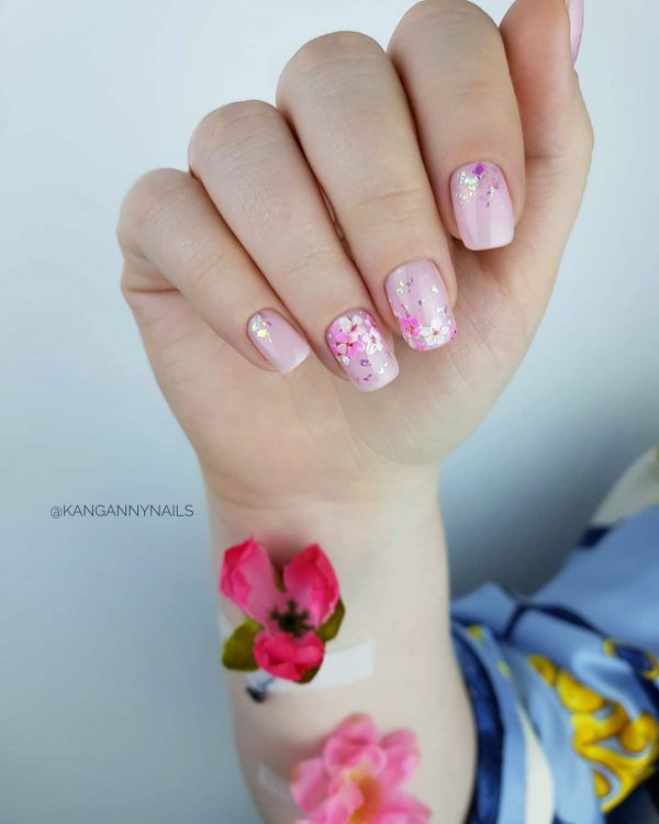 Сверкающий маникюр в школу с блестками-камифубуками