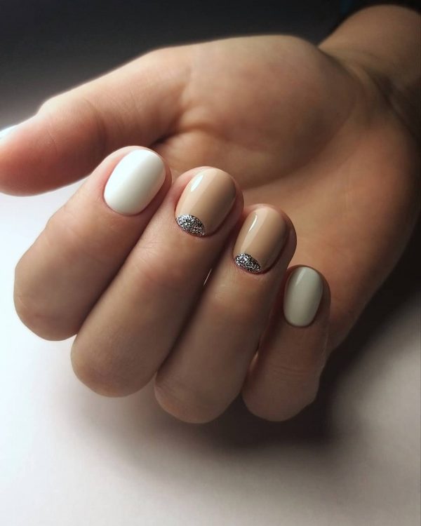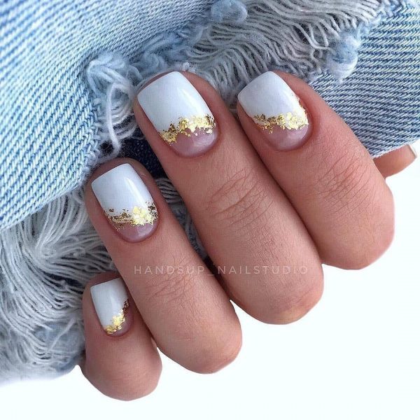 Из современных нейл-трендов в школьном маникюре для девочек подростков 2026 нашлись интересные решения с использованием в дизайне модной фольги. Уместным будет подобный декор на белых ногтях с negative space, в нежном бежевом маникюре и бледно-розовых тонах.