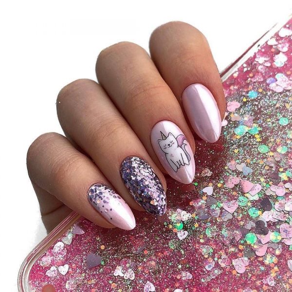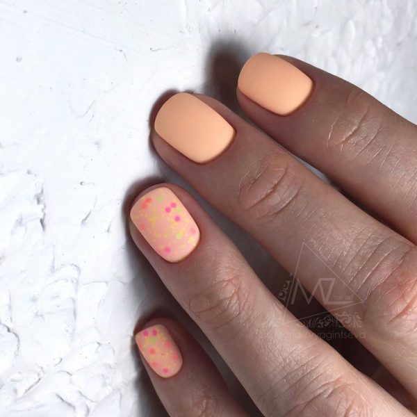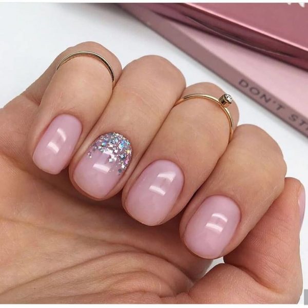 Конечно вы можете сделать маникюр в школу в популярнейшем дизайне с выделением мизинца или безымянного пальчика, покрыв ноготки полностью глиттером, однако, намного свежее и гармоничнее будет смотреться тот же нюдовый или розовый маникюр в дизайне с разноцветными блестками-камифубуками.