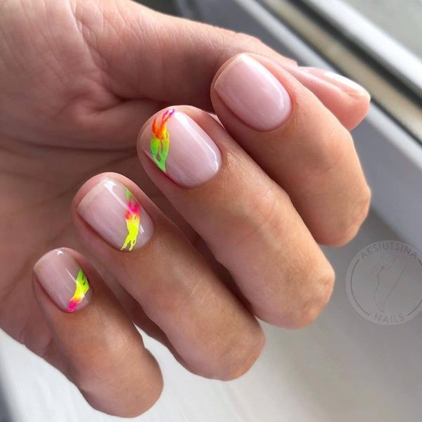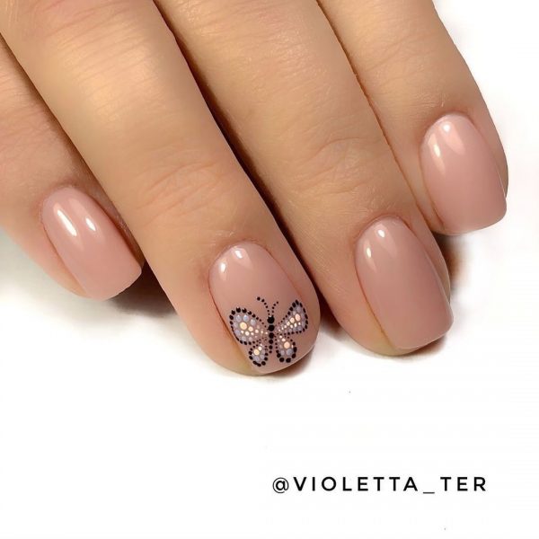 Помимо женственного розового маникюра, в школу можно сделать еще один вариант в натуральных оттенках. Стильный и лаконичный нюд в школьном маникюре 2026 придется поддать дополнительному дизайну. Парочка разноцветных точек в рядок, размытый цветной узор, тематический рисунок на акцентном ноготке отлично впишутся в палитру нюдовых тонов.