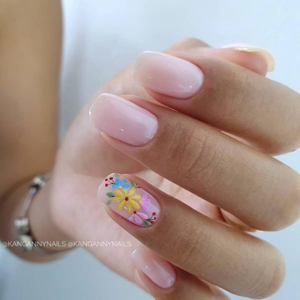 Довольно популярным и изумительным вариантом маникюра в школу для девочек подростков будет цветочный нейл-арт-дизайн. Даже самые простые цветочки пусть однотонные и нарисованные с помощью точек и иголки великолепно украсят школьный маникюр.