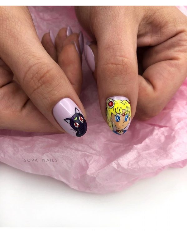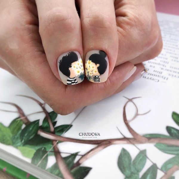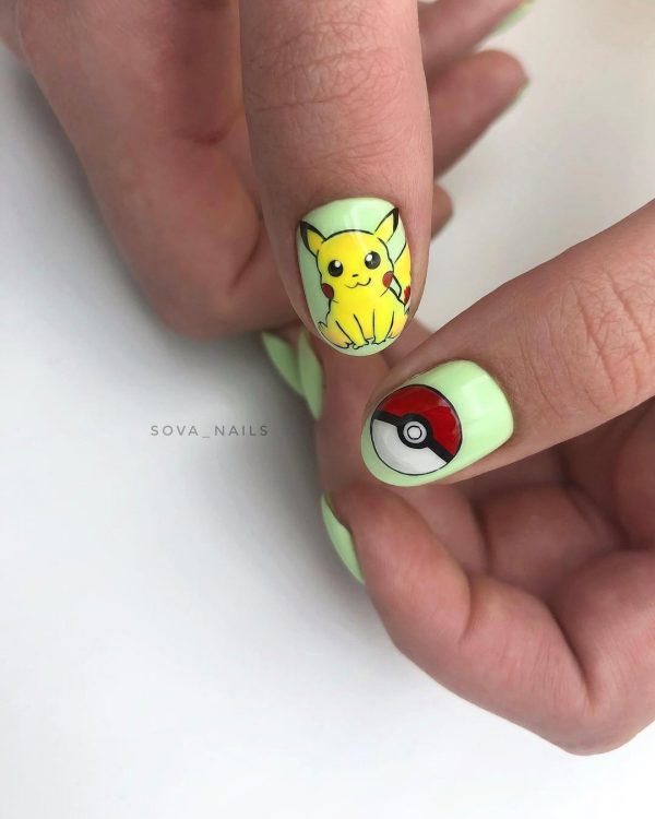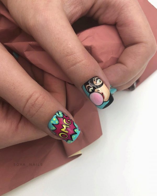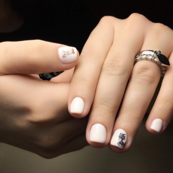Очень мило и круто в коротком маникюре в школу 2025 будут смотреться рисунки с любимыми персонажами и героями мультфильмов, кинофильмов, комиксов и сказок. Красивый портрет принцессы, забавный Микки и смешной Пикачу нарисованные кистью на отдельных ноготках никогда не будут лишними в дизайне школьного маникюра.