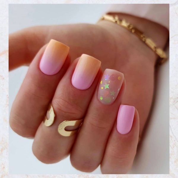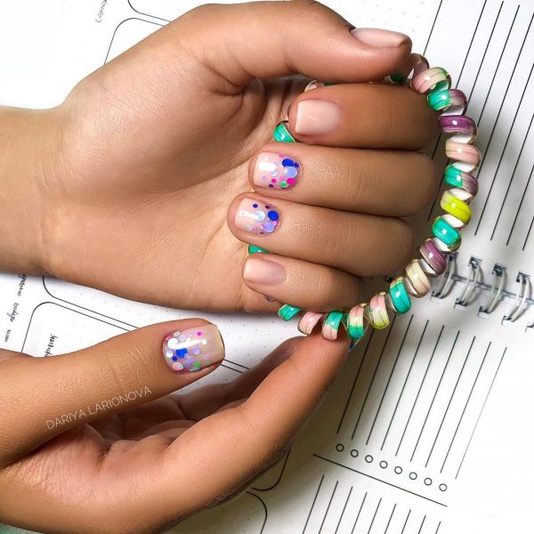 Конечно вы можете сделать маникюр в школу в популярнейшем дизайне с выделением мизинца или безымянного пальчика, покрыв ноготки полностью глиттером, однако, намного свежее и гармоничнее будет смотреться тот же нюдовый или розовый маникюр в дизайне с разноцветными блестками-камифубуками.